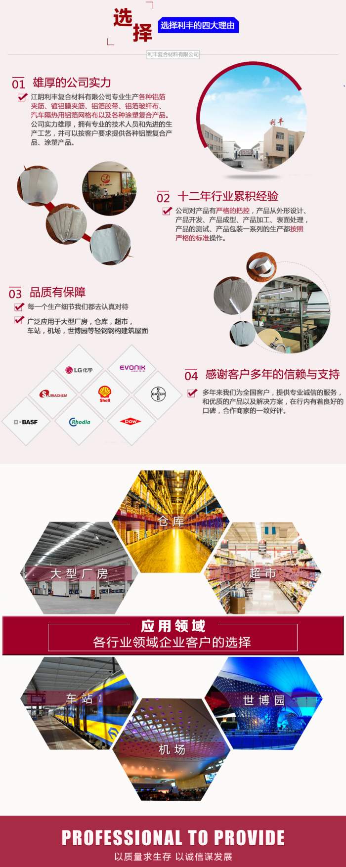 利豐牌保溫貼面:廣泛應用于大型廠房,倉庫,超市,車站,機場,世博園等輕鋼鋼構建筑屋面,多與玻璃棉等保溫材料復合使用,或用于墻體,地暖,空調風管等保溫隔熱,也可貼于保溫板材表面起到保溫、隔熱、防火,水汽阻隔,吸聲防腐等作用。